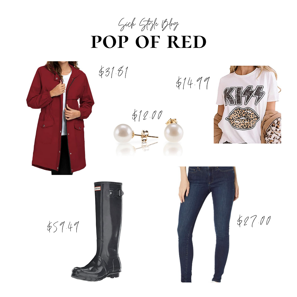 Finally, I put together a colorful and fun look to offset the grey colors associated with rainy days! I love Hunter boots for rain - they're a definite splurge, but they do an excellent job of keeping my feet warm, comfy, and dry. To play off of the iconic red outline of the brand's logo, I paired them a super feminine red jacket. This jacket is super flattering in the cut, and is nice and long to keep your thighs dry. I also added a pair of pearl earrings for added femininity, blue jeans to neutralize the brighter elements, and a cheetah print band tee for a fun element. I personally like the vibe of the top, but this outfit would also be great with a simple white button up blouse or turtleneck sweater!